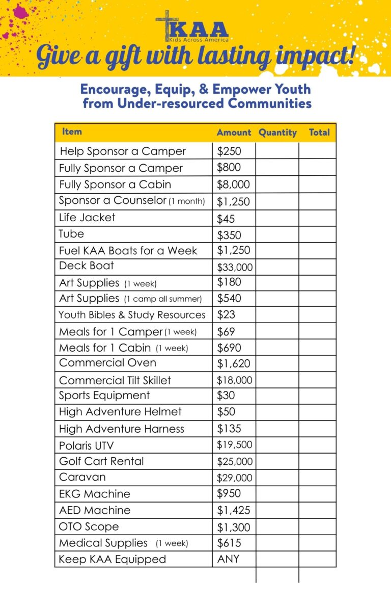 Kids Across America (KAA) is a 501(c)(3) non-profit organization. Contributions to KAA are tax-deductible as allowed by law.